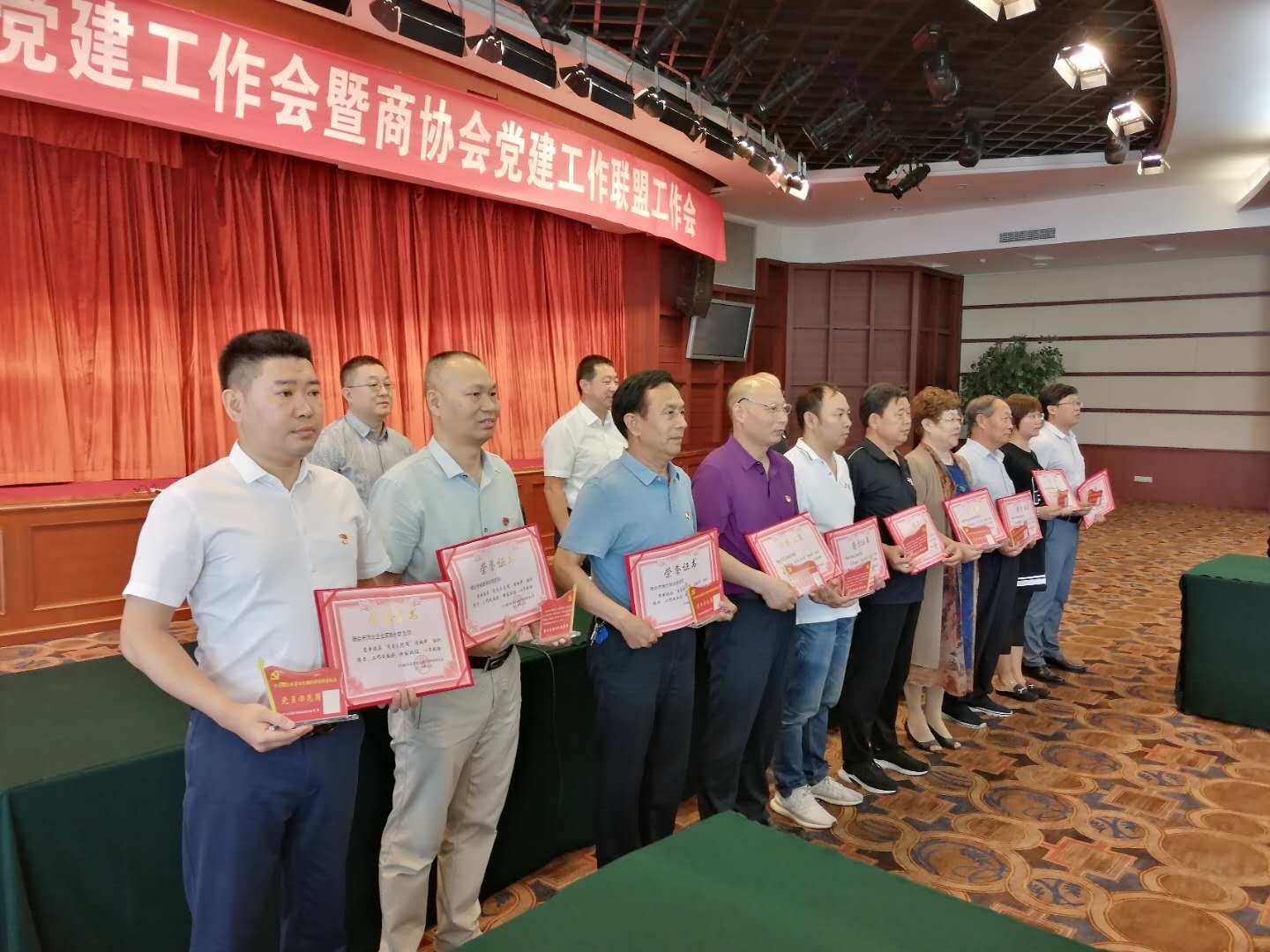 2020年7月10日上午,烟台市工商联所属商会党建工作会暨商协会党建工作联盟工作会在东方海天大酒店召开,烟台市福建商会受表彰,领取了“大手拉小手”活动荣誉证书和“党员示范岗”牌。商会副会长吴建斐作为“党员先锋岗”代表做交流发言;办公室主任宋太清同步参加会议。