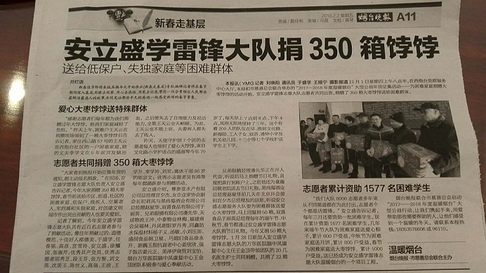 2018年2月1日星期四上午八点半,在西炮台党群服务中心大厅,烟台晚报、烟台市慈善总会联合举办的2017-2018年度“温暖烟台”大型公益年货征集活动-为贫困家庭捐赠大枣饽饽的活动开始,安立盛学雷锋志愿大队志愿者共同出资,捐赠了350箱大枣饽饽送给困难群体,我们福建商会做为志愿大队的一名社团志愿者,积极参加捐赠活动,在春节即将到来之际,把我们温暖送道市区、街道、社区的困难家庭、低保户、残疾人、空巢老人、军烈属和失独家庭,对创建文明城市作出突出贡献的人也关爱到。