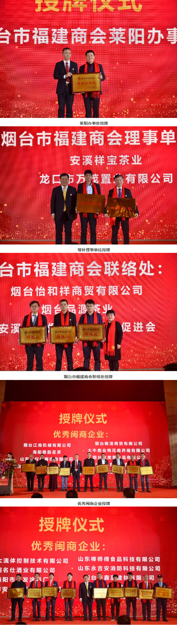 大会进程中,商会会长吴福林先生为莱阳办事处授牌,莱阳办事处筹备组组长李锋先生上台接牌。商会监事长蔡水源先生对新增的安溪祥宝茶业王明伟先生、龙口市万茂置业有限公司陈聪贤先生等2家理事企业进行授牌。商会秘书长林梅女士为烟台怡和祥商贸有限公司、安溪山东烟威茶业发展促进会、烟台品源茶业等3个烟台市福建商会联络处进行授牌。商会会长吴福林先生、监事长蔡水源先生为烟台江南机械有限公司、山东远大流体控制技术有限公司、海阳雅韵茗茶、山东汇仪瑞服饰有限公司、烟台市三禾田电子应用材料有限公司、烟台敏溶商贸有限公司、大牛鹿业梅花鹿养殖有限公司、烟台欧美香食品有限公司、烟台丹凤朝阳广告有限公司、烟台家美妇产医院、海阳名仕酒业有限公司、海阳市永发涂料厂、海阳市安贞堡餐饮有限公司、山东棒师傅食品科技有限公司、山东永吉安消防科技有限公司、烟台市鑫豪建材有限公司、烟台闽盛建材有限公司、烟台品源茶业等18家优秀闽商企业进行授牌。